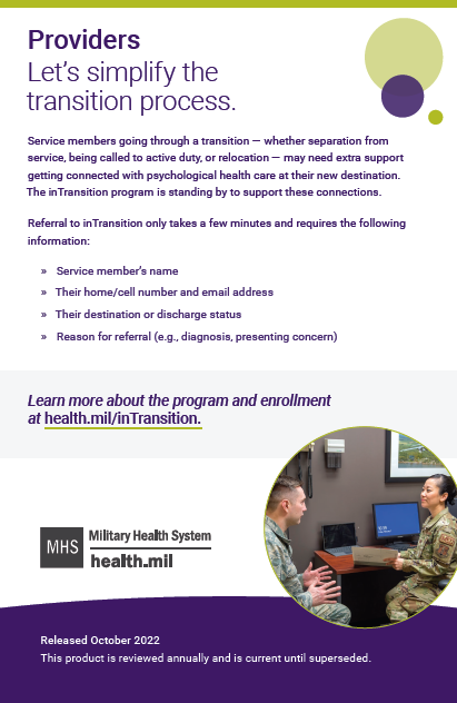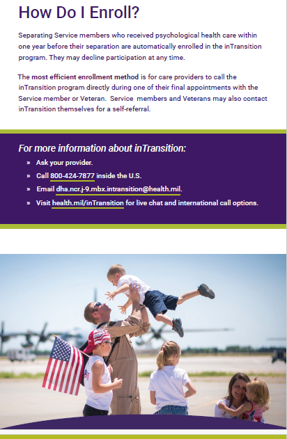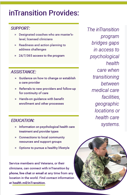The above link is the InTransition, free and voluntary program for mental health care support during times of transition.